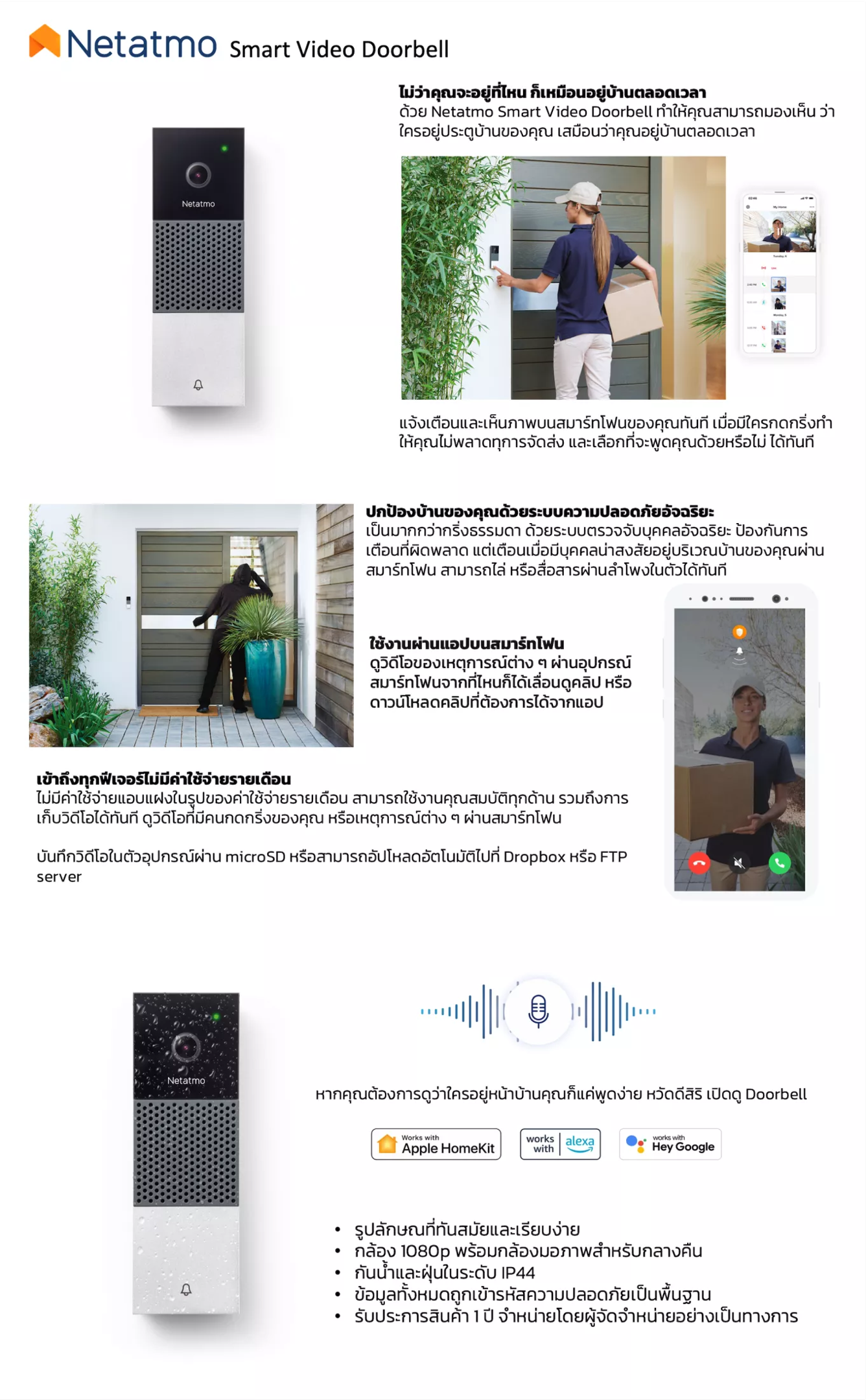กริ่งพร้อมกล้อง แจ้งเตือนทันทีเมื่อมีคนกดกริ่งหรือมีความเคลื่อนไหว ลำโพงและไมค์ในตัว สามารถสนทนาได้ทันทีผ่านสมาร์ทโฟน