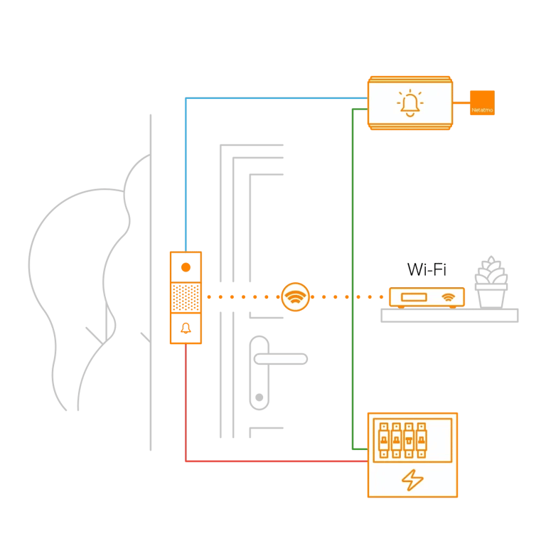กริ่ง Netatmo Smart Video เชื่อมต่อกับเสียงระฆังของคุณผ่านการเดินสายไฟฟ้าที่มีอยูตําแหน่งของเสียงระฆังของคุณอาจแตกต่างกันไป: โดยทั่วไปจะพบใกล้ประตูหรือในแผงไฟฟ้าของคุณ